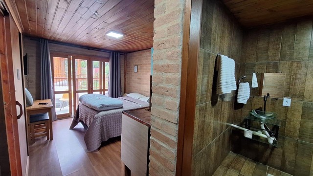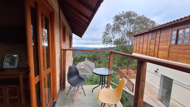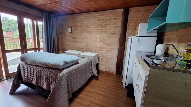 Os chalés são compostos de mini cozinha, banheiro e varanda.