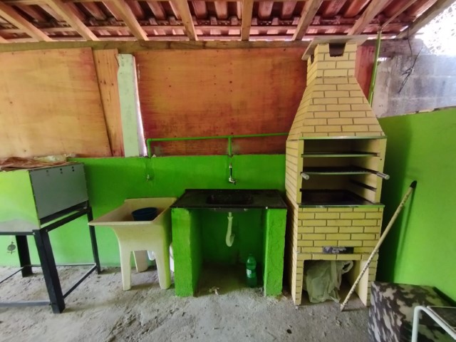 O Chalé possuí na parte externa, uma área de lazer com churrasqueira e mesa de apoio.